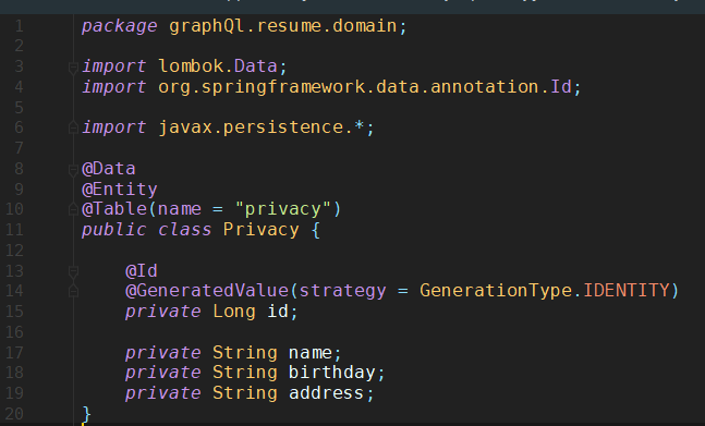 String type의 name, birthday, address 변수와 primary key(기본키)로 사용할 Long type의 id를 가지고 있다.