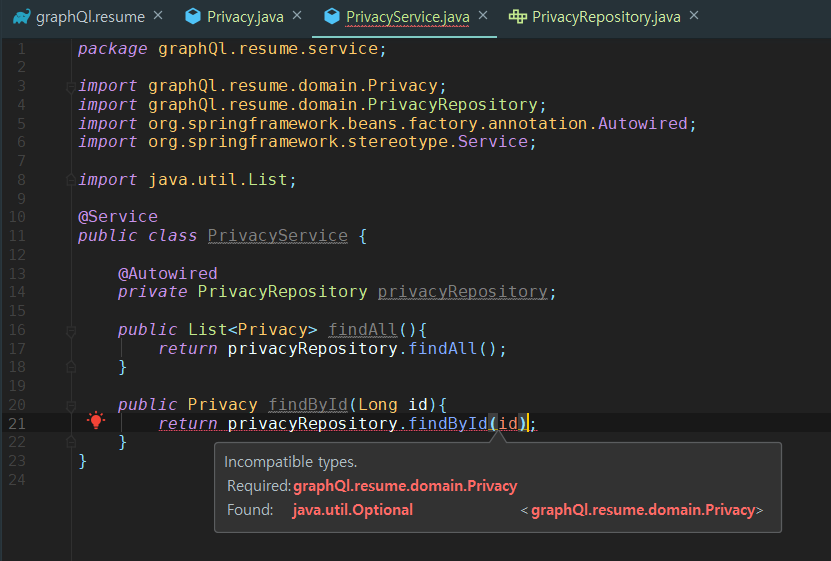 다음으로는 privacyService class를 생성했고, 이 class는 Service Class로