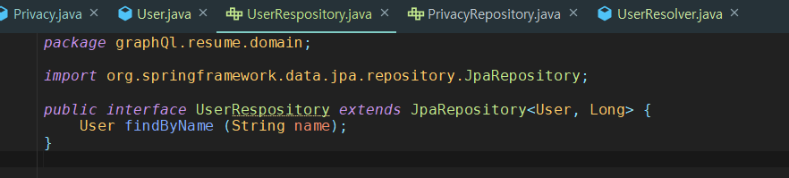 마지막으로 UserResolver 라는 class를 생성했는데 Query나 Mutation처럼 GraphQLResolver 을 implements 받아