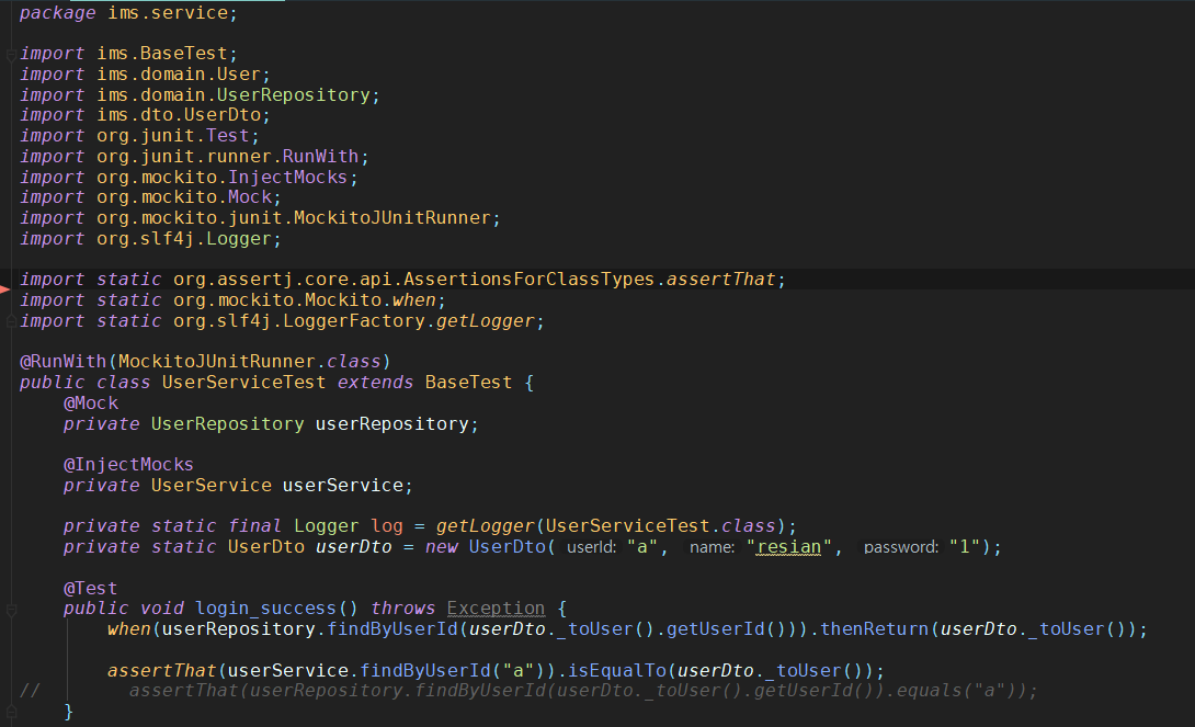 다음으로 assertThat을 이용하여 findByUserId에 "a"와 userDto._toUser()가 같은 객체인지를 확인하였다.