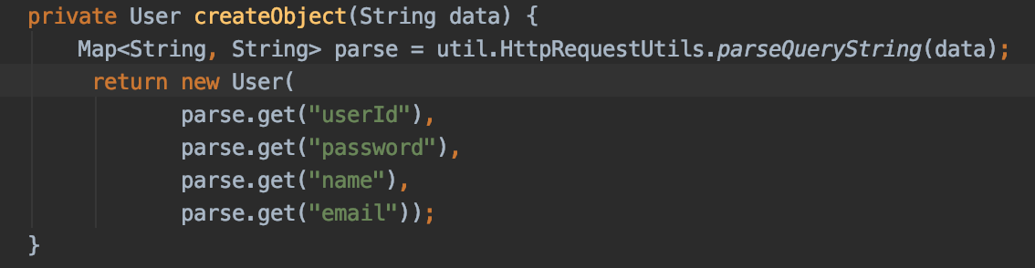 createObject Method에서 parseQueryString Method를 통해 Map으로 만들어진 User객체를 만들게 하였다.