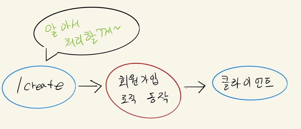 그러므로 /create url이 들어온 순간 회원가입 로직이 동작할 것이고 들어온 요청에 해당하는 응답을 클라이언트에게 보내줄 것이다.