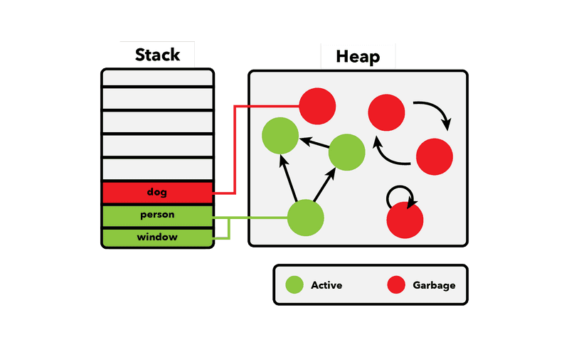 - 힙의 메모리는 특정한 방식으로 정렬되지 않기에 스택에 대한 참조를 유지해야함.